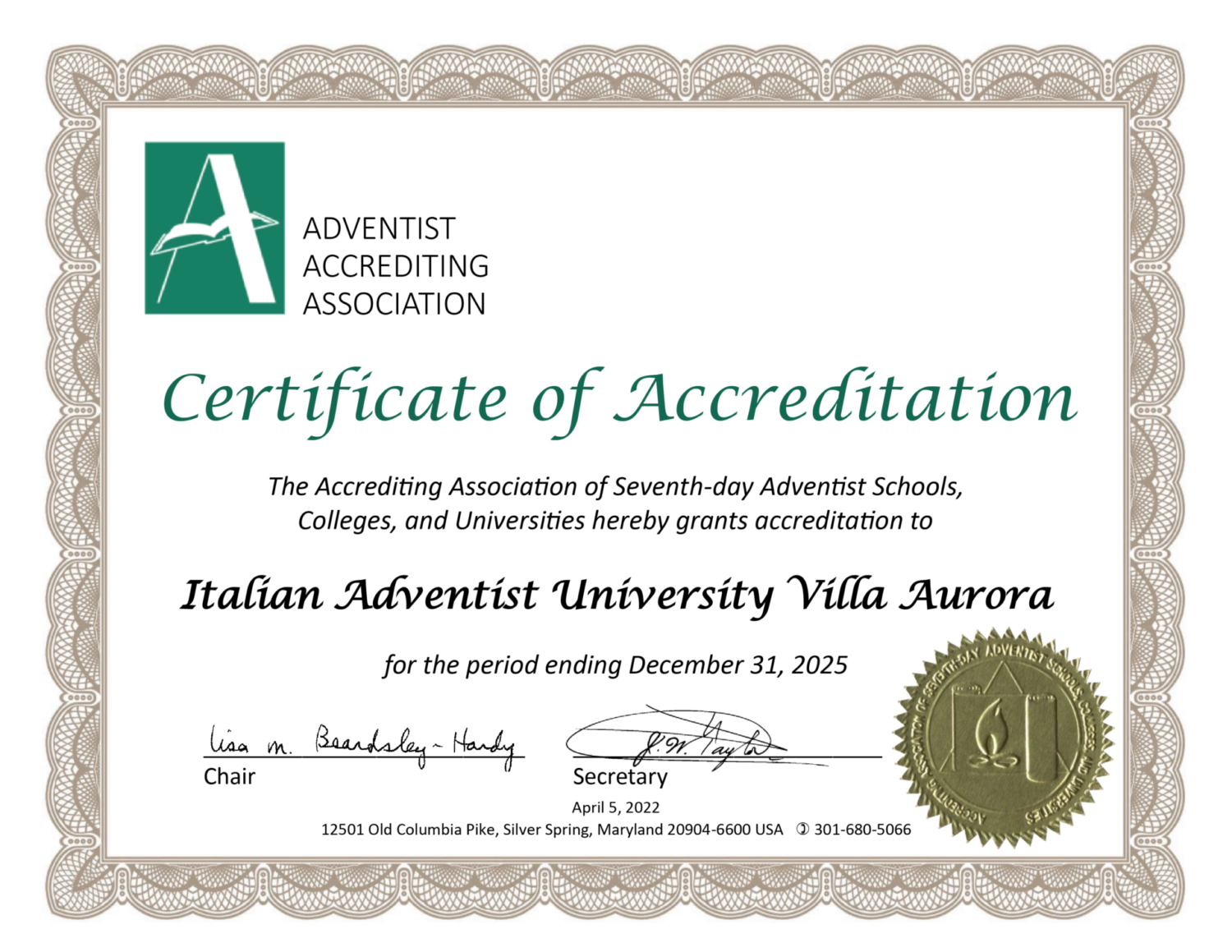 L’Istituto Universitario Avventista appartiene al sistema mondiale di educazione avventista. Infatti, è accreditato, con la denominazione di Italian Adventist University Villa Aurora, presso l’Accrediting Association of Seventh-day Adventist Schools, Colleges, and Universities (AAA) della Conferenza Generale degli Avventisti del Settimo Giorno.