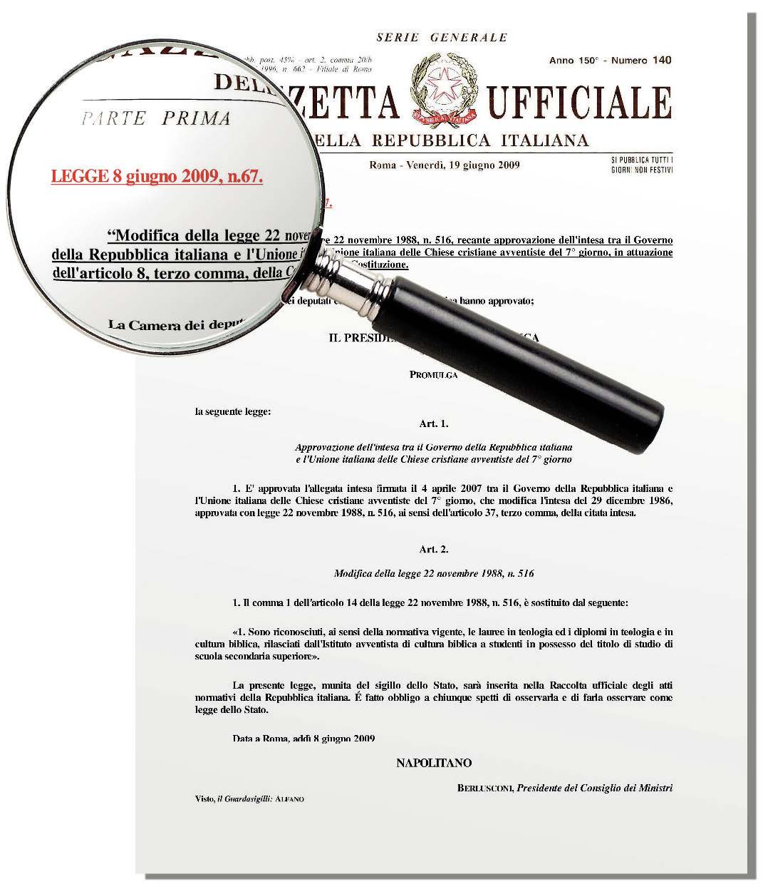 1. Ai sensi della legge 22 novembre 1988, n. 516, come modificato della legge 8 giugno 2009, n. 67, sono riconosciute come lauree e lauree magistrali dell’Ordinamento universitario italiano, le Lauree e le Lauree Magistrali rilasciate dall’Istituto Avventista di cultura biblica, Ente ecclesiastico avventista con personalità giuridica, riconosciuto ai sensi dell’art. 19 della legge 22 novembre 1988, n. 516.
