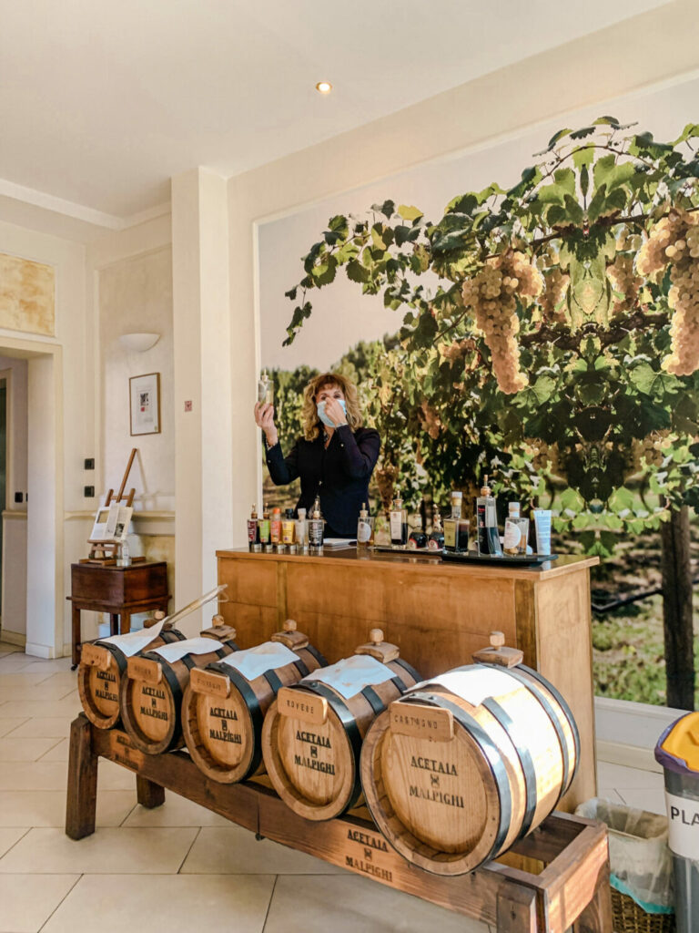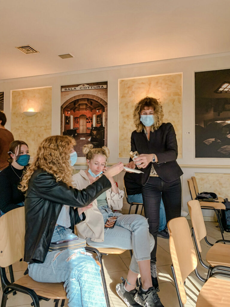 Dopo la nostra esperienza in Ferrari, siamo andati in un’acetaia di Modena. Abbiamo potuto salire in una stanza piena di botti e assistere al processo di trasformazione delle uve in aceto balsamico. Ogni botte era destinata a riposare per un certo numero di anni, dai 12 ai 25. A seconda del tipo di uva e del numero di anni, l’aceto balsamico avrebbe prodotto sapori e corposità diversi. Dopo aver appreso la storia dell’azienda e il suo successo nella creazione di un autentico Aceto Balsamico Tradizionale di Modena, abbiamo potuto fare una degustazione. Abbiamo provato i gusti bianco, tradizionale, arancia, fico, mela, tartufo e altri ancora. Era assolutamente delizioso! Con un tale fascino per i sensi, molti di noi non hanno resistito all’acquisto di alcune bottiglie da portare a casa.