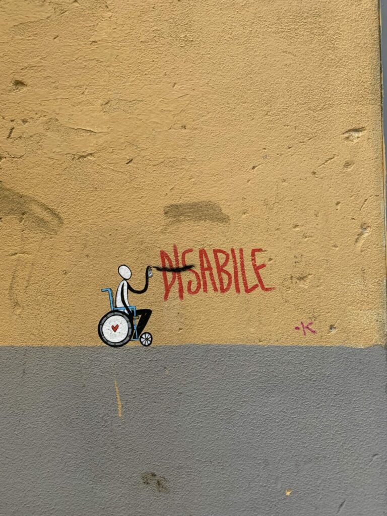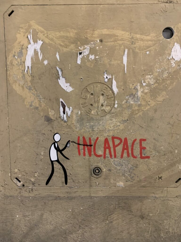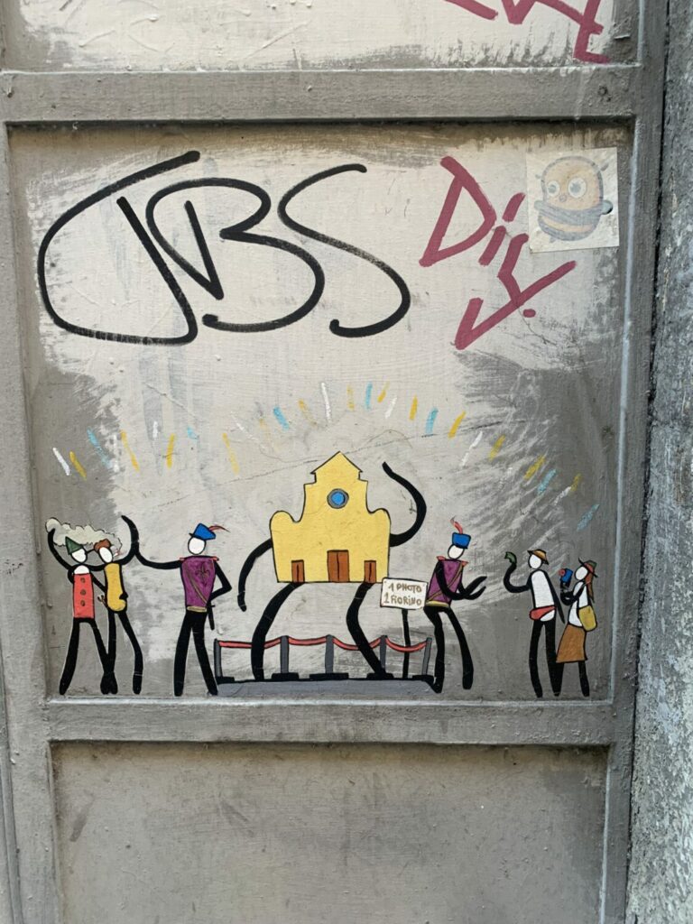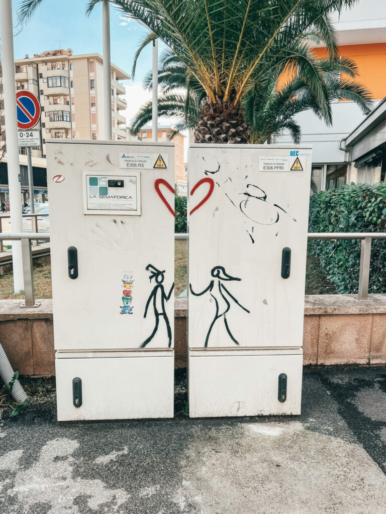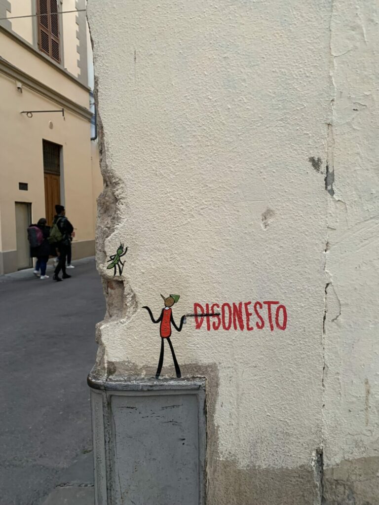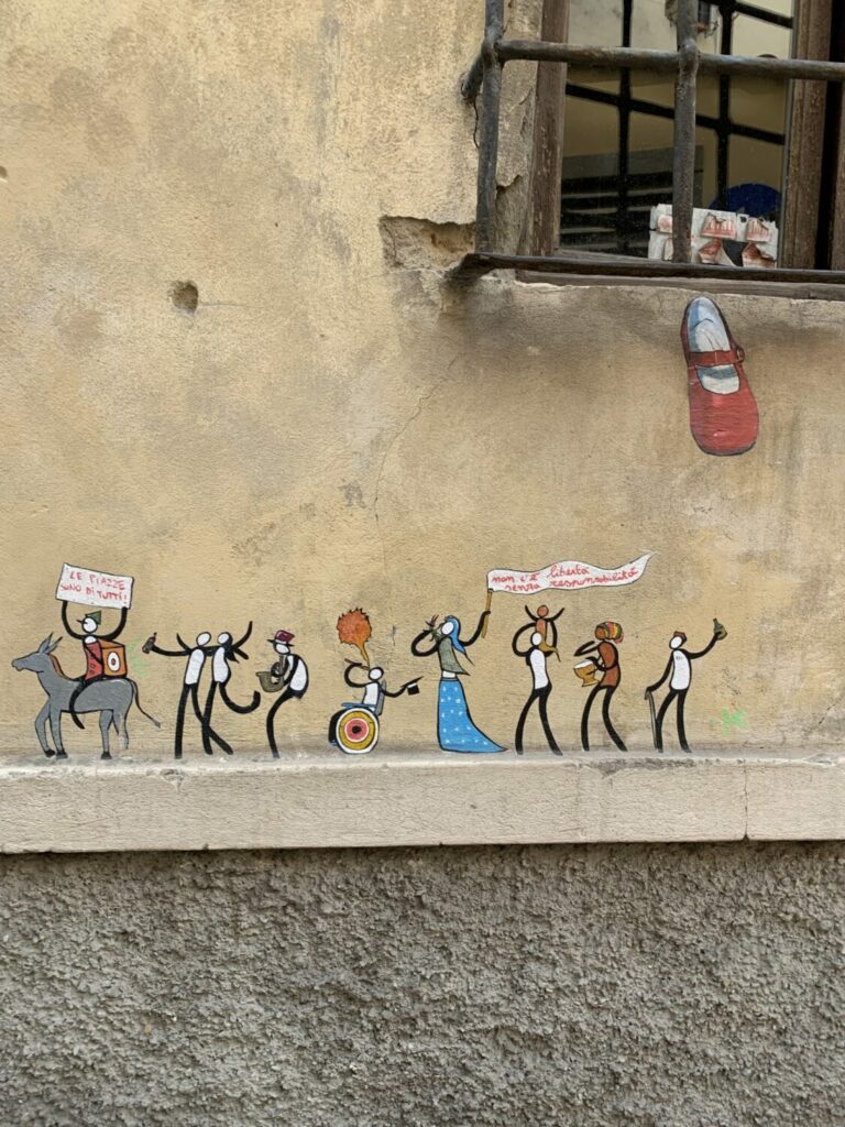 Se hai camminato per le strade di Firenze, è probabile che tu abbia visto le opere di Exit Enter. Le scene e i messaggi variano, ma gli elementi rimangono sempre gli stessi: la figura umana semplice e il messaggio che l’accompagna. Un muro qui, una scalinata là — puoi trovare la sua poesia visiva quasi ovunque. Davvero, Exit Enter ha fatto della città di Firenze la sua tela, e delle verità universali e nascoste dell’umanità il suo colore.